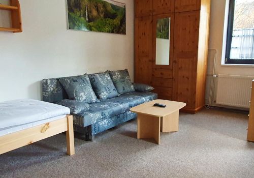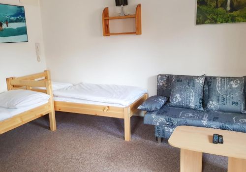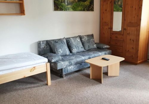 Salon z sypialnią: 2 łóżka pojedyncze, 1 podwójna rozkładana sofa, szafa, telewizor i radio.