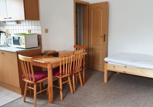 Wyposażony aneks kuchenny z naczyniami (4 palniki, kuchenka mikrofalowa, zamrażarka, ekspres do kawy, czajnik elektryczny), stół jadalny z 4 krzesłami.